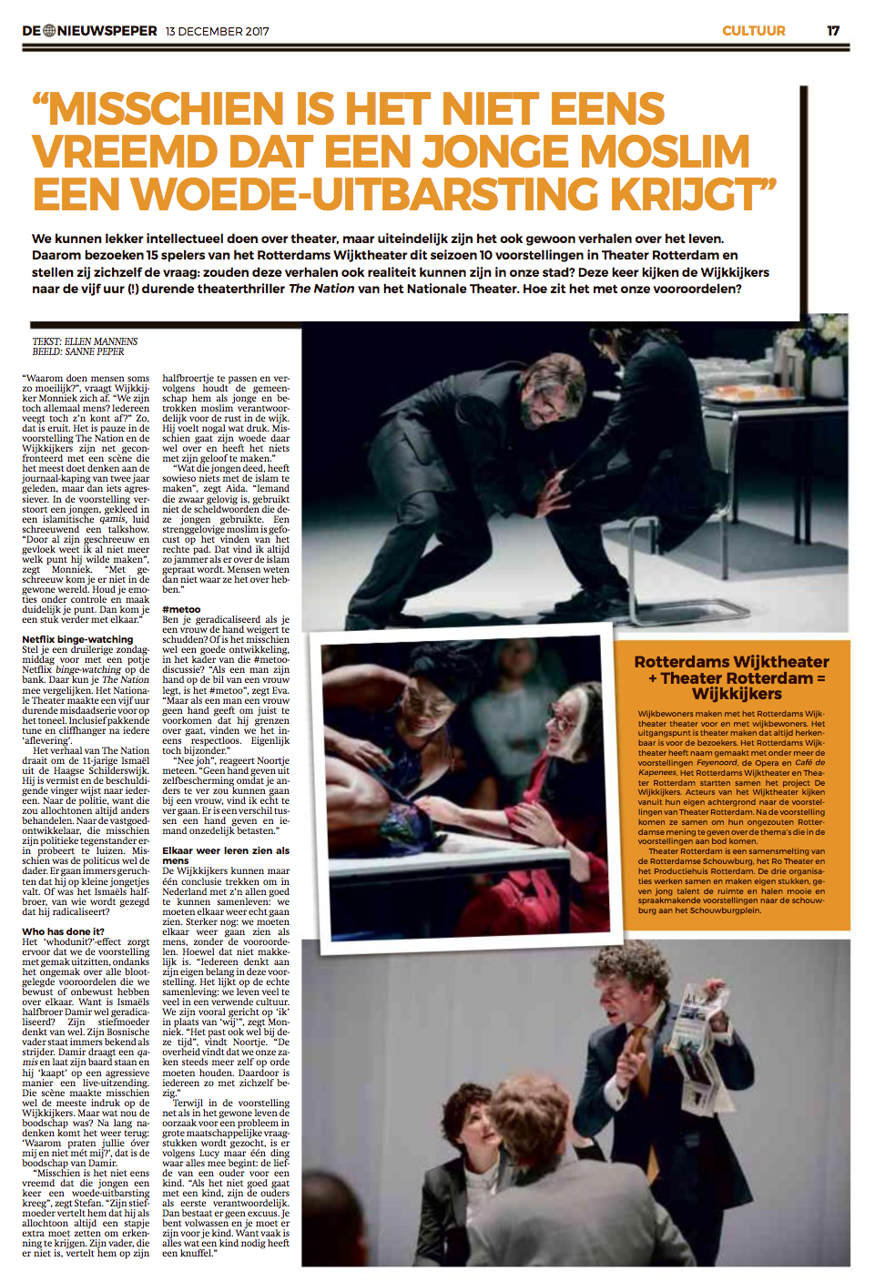 Op zondag 19 november waren de Wijkkijkers te gast bij de marathon van The Nation, van het Nationale Toneel. Een voorstelling als een Netflix-serie, en dan 5 uur lang afleveringen achter elkaar bingewatchen. Maar die uren gingen moeiteloos voorbij! Het artikel dat erover verscheen in De Nieuwspeper van 13 december lees je hier.